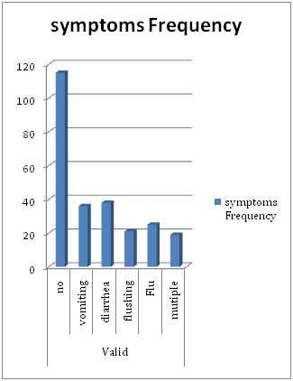 Figure 3 Almost 120 patients were asymptomatic, 38 patients having diarrhea, and 36 patients having vomiting 24 patients having flu like symptoms, flushing in 18 patients and 18 patients having more multiple presentations.