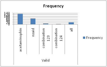 Figure 6 The acetaminophen alone used in 130 patients Nsaid alone used in 78 numbers of patients. Combination of three drugs acetaminophen, Nsaid and steroid were used in 10 numbers of patients and combination of acetaminophen, Nsaid and DMarts in 5 numbers of patients. The combination of all drugs was used in 140 numbers of patients.