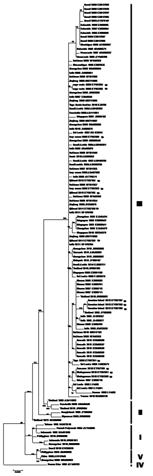 Figure 1 Phylogenetic tree of 116 DENV-3 strains based on E nucleotidic sequence (1-1479) using the Maximum Likelihood method based on the General Time Reversible + I + Γ model. Strains isolated in our laboratory, identified by *, belong to the genotype III. Node values were determined for 1,000 replicates. Branch lengths are correlated to the number of substitutions per site. Isolates are labeled as follows: country, date of isolation, genbank accession number.