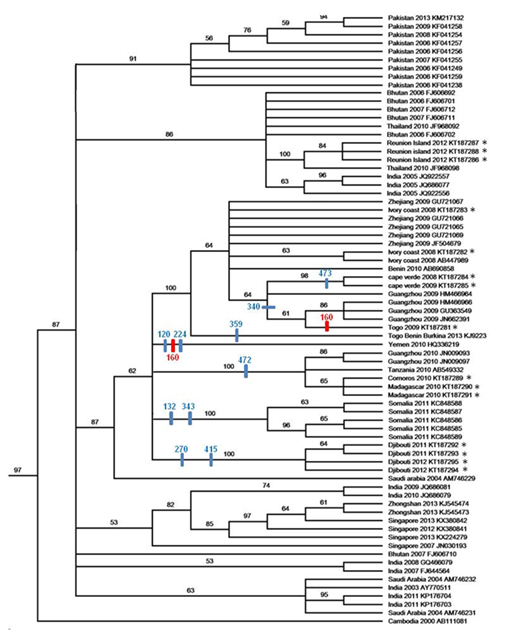 Figure 2 2A: Phylogenetic tree of 116 DENV-3 strains 1986- 2014 based on nucleotidic sequence of E (1-1479) using Parcimony analysis (Boostrap consensus tree). DENV-3 genotype IV isolated in Puerto Rico in 1963 (AY146762) was used as an out-group to root the tree. Node values were determined for 1,000 replicates. Branch lengths measured the number of substitutions per site. The 15 strains isolated in Africa between 2008 and 2012 are represented by*. 2B: Magnification of the part of the parcimony analysis. New sequences are noticed by *. On the branches of the tree, in blue, are noticed amino-acid positions of acquired non-synonymous mutations compared to the Saudi Arabia 2004 strain (G340E, M473L, K359R, Q120H, T224A, V489A, S472P, N270T, D415E, Y132H, K343R), and in red the mutation A160V which appeared independently in 2 lineages. Isolates are labeled as follows: country, date of isolation, genbank accession number.