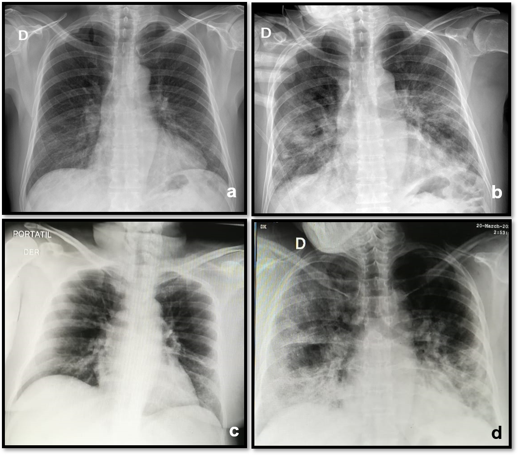 Figure 1 Chest x-ray with the evolution of two patients. a).- Male. 59 years old. March 25. At admission: Interstitial lung pattern in lower zones with right predominance. b).- March 31. in ICU: Right alveolar opacities in mid and lower zones Left hazy opacity in mid and lower zones. Dyspnea got worse and required invasive mechanical ventilation. Dies 14 days later. c).- Female. 59 years old. March 18. At admission: Lower vague hazy densities. d).- March 20. in ICU: Bilateral diffuse interstitial pattern with ground glass opacities in the right upper and lower areas. Greater lower right opacity due to peribronchovascular thickening. Dyspnea got worse and required invasive mechanical ventilation. She had a full recovery and was discharged 23 days later.