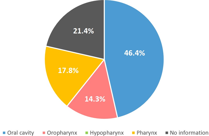 Figure 1 Distribution of collected samples by anatomic site. A total of 13 samples (46.4%) were collected from oral cavity, 4 (14.3%) from oropharynx, and 5 (17.8%) from pharynx. There was no information for 6 samples and there were no samples collected from hypopharynx.