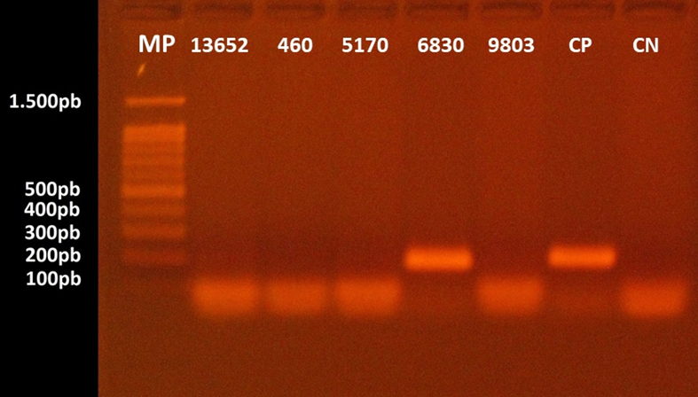 Figure 2 Agarose gel electrophoresis for the separation of HPV DNA fragments. The numbers 13652, 460, 5170, 6830, and 9803 correspond to patients’ identification code. HPV DNA was detected in the sample 8490 which was collected from the hard palate of a 48 years-old male patient diagnosed with squamous cell carcinoma. MP: molecular marker ranging from 1.500 to 100 base pairs; CP: positive control; CN: negative control.