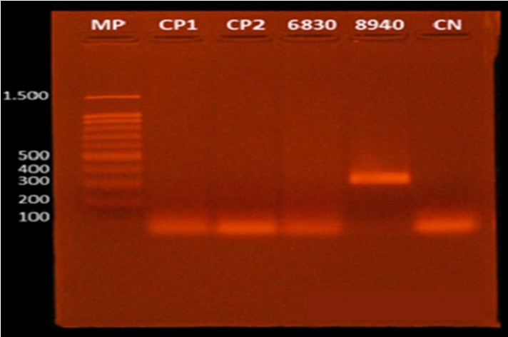 Figure 3 Agarose gel electrophoresis for the separation of HPV DNA fragments. HPV 11 DNA was detected in the sample 8490 which was collected from the hard palate of a 39 years-old female patient, with no smoking or drinking habits, diagnosed with papilloma of the larynx. MP: molecular marker ranging from 1.500 to 100 base pairs; CP: positive control; CN: negative control.