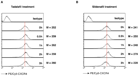 Cells were treated with 1 nM Tadalafil (A) or 10 nM Sildenafil (B) for a time course from 0 to 3 hours. Cells were stained with PE/Cy5 labeled anti-CXCR4 antibodies, then washed and analyzed with flow cytometry. The CXCR4 expression level was measured by the Mean intensity (M).