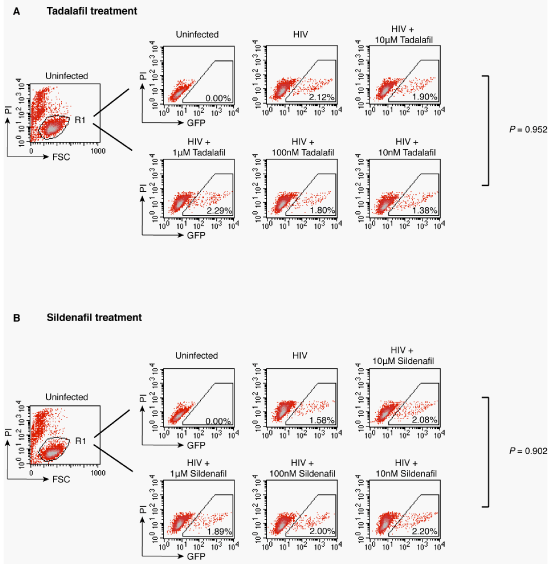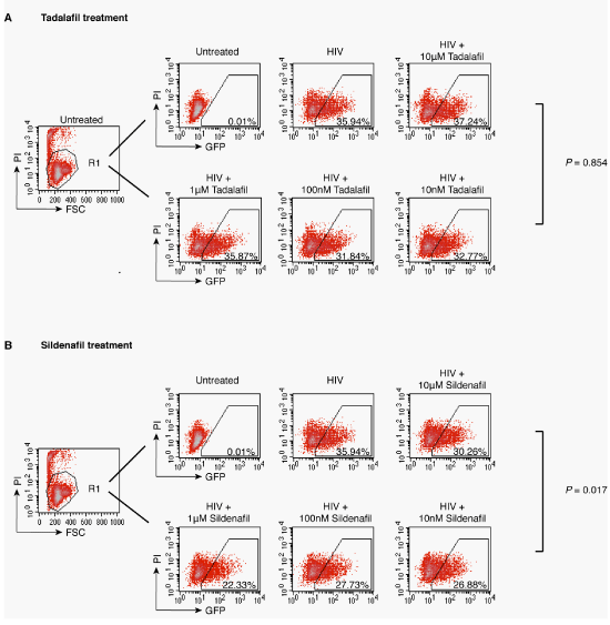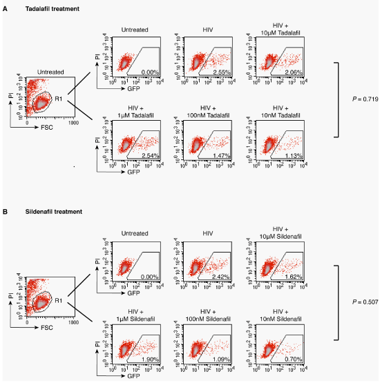 Cells were treated with Tadalafil (A) or Sildenafil (B) at the indicated concentration for 1 hour prior to infection with concentrated HIV-1NL4-3 (2500 ng) for two hours. Following infection, cells were washed and cultured for 72 hours in the continuous presence of the reagents, and analyzed with flow cytometry. To exclude cytotoxicity, cells were also stained with propidium iodide (P.I.) and GFP expression was measured only in the viable cell population.