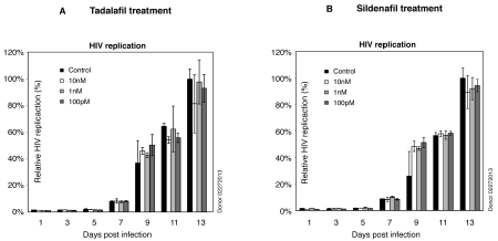 PBMCs were purified from healthy donors. For HIV-1 infection, cells were pre-activated with PHA and IL-2 for 24 hours. One million cells were treated with each of the reagents for 1 hour (A for Tadalafil, B for Sildenafil), and infected with HIV-1NL4-3 (250 ng p24) for 2 hours in the presence of the reagents. Infected cells were washed and re suspended in 1 mL of fresh medium with PHA plus IL-2 and the drug added. Additional PHA plus IL-2 were added every 48 hours. Supernatant was taken for measuring viral p24 release by p24 ELISA.