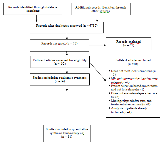 Searches in other sources: Grey literature studies were obtained from relevant Open Rey6 electronic journals and databases. Congress abstracts related to tuberculosis and relapse were consulted, and bibliographical references were searched in the selected studies.