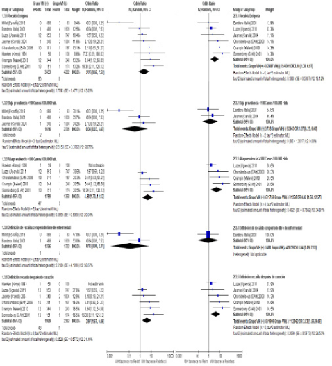 Globally, 115 events among HIV (+) patients and 148 among HIV (-) patients were obtained. Figure 3 (analysis 1.2.1) shows that relapse by this mechanism has an OR of 1.22 IC 95% [0.75, 1.97] I2 55%, and, after stratifying for prevalence, this estimator is non-conclusive. High prevalence OR of 0.88 [0.61, 1.25] I2 0%, and low prevalence OR 1.78 [0.86, 3.69] I2 55% Figure 3 (analyses 1.2.2 and 3).