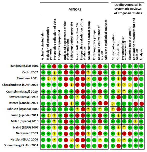 Figure 5 Bias risk based on the Minors and Quality Appraisal in Systematic Reviews of Prognosis Studies bias evaluation tools, discriminated by study.
