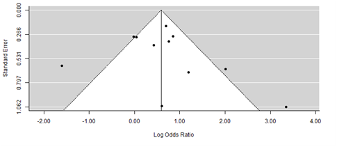 Publication bias was estimated based on the funnel plot in Figure 6, which shows symmetry. Additionally, an assymetry regression Egger test was applied (Regression: Asymmetry: z = 1.3565) p = 0.1749, which indicated no publication bias.