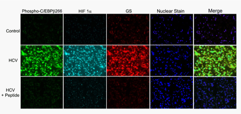 We found that HCV genotype 1 infection after 72 hr (viral load ∼ 7 x106 IU/uL) stimulated a zone-3 phenotype since the cultured hepatocytes expressed HIF-1α and GS.2,5 HCV infection also induced phosphorylated-C/EBPβ-Thr266 (the human homologous phosphoacceptor7,8,10) in these cultured hepatocytes. Control uninfected, normal quiescent cultured human hepatocytes did not express phosphorylated-C/EBPβ-Thr266, HIF-1α or GS (Figure 1).