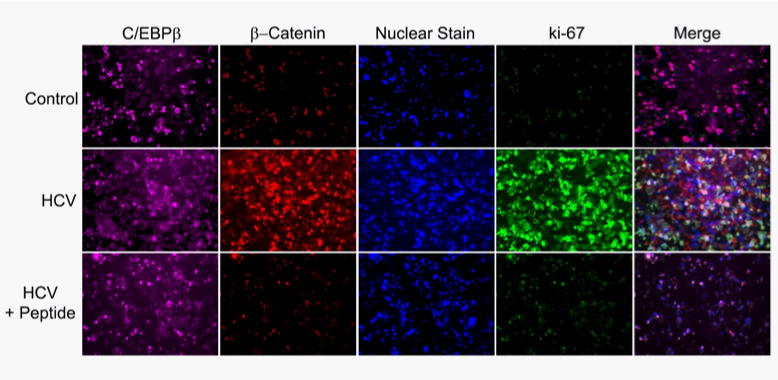 We found that HCV infection did not affect the expression of unphosphorylated C/EBPβ-Thr266 compared to control uninfected hepatocytes but stimulated hepatocyte proliferation as determined by the expression of ki67. Hepatocyte proliferation occurred in zone-3 phenotypic hepatocytes, judging by the expression of β-Catenin, another marker of zone-33,4 (Figure 2).