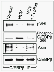 Figure 3 Unphosphorylated-C/EBPβ-Thr217 is physically associated with pVHL and Axin. Experiments were performed as described in Figure 1. C/EBPβ was immunoprecipitated from the 72-hr HCV-infected human hepatocyte’s cell lysates. Unphosphorylated-C/EBPβ-Thr217 was physically associated with pVHL and Axin in uninfected normal primary human hepatocytes (Left lane) and in HCV-infected cultures treated with the inhibitory peptide (Right lane). In HCV-infected human hepatocytes not treated with the peptide, phospho-C/EBPβ-Thr266 is not associated with either pVHL or Axin (Center lane).