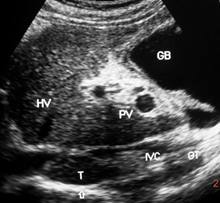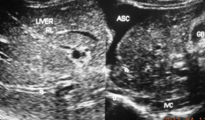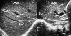 Figure 1a Hepatic vena cava syndrome is diagnose by ultrasonography and color Doppler (US/CD) examination of inferior vena cava and liver. This is a US/CD of young boy with CHB in replicative phase. It shows stenosis of the inferior vena cava at the site of hepatic vein opening with thick posterior wall and organized thrombophlebitis on it, the distal segment is dilated. Hepatic veins are prominent and show obstruction to blood flow at their outlets. The blood flow pattern in inferior vena cava and hepatic veins are abnormal.
