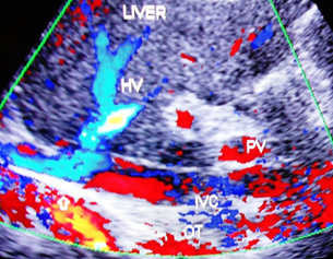 Figure 1b Ultrasonography & Color Doppler of inferior vena cava and liver showing stenosis of the vein at the site of hepatic vein opening with obstruction to blood flow, distal segment dilated with presence of old organized thrombus along posterior wall. of hepatic portion. Hepatic veins prominent with obstruction to blood flow at the outlets.