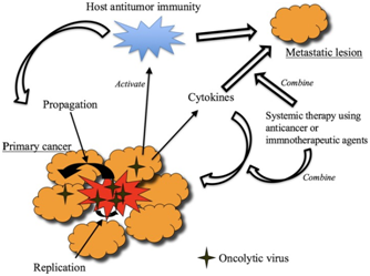 Local replication of oncolytic virus induces specific antitumor immunity in the course of its oncolytic activities that act on remote lesions. A combination with immune checkpoint inhibitors or chemotherapy may enhance the efficacy of oncolytic virus therapy. Arming oncolytic viruses with immunostimulatory gene(s) or cancer therapeutic genes may also be beneficial.