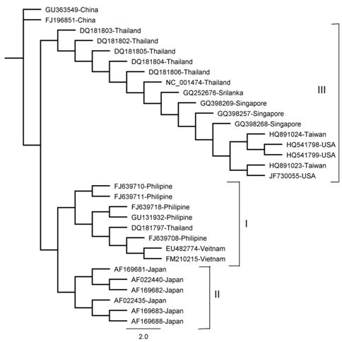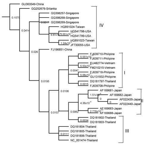 A close similarity in the serotypes of Vietnam and Philippine was observed. They are found in the same clade in all the five phylogeny trees. Their clade showed a closest relation to the serotypes of Japan in our study. This shows that these serotypes have been derived from a common ancestor which is the serotypes of China and Thailand in our study.