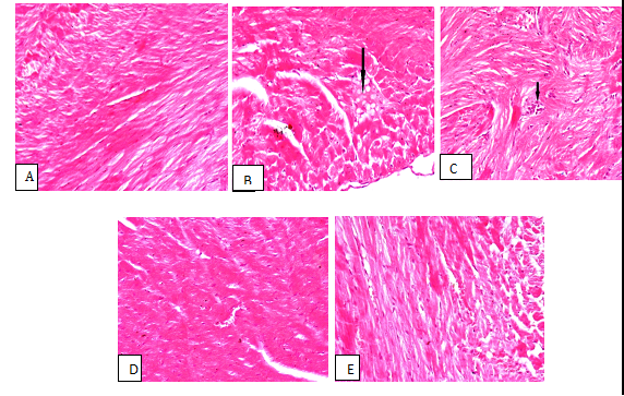 Figure 1 Stained sections of the heart tissues from BALB/c mice (H&E, magnification 200 X): A: non-infected and non-treated mice; B: infected and non-treated mice; C: RBV mice; D: infected mice with RV and treated with the methanolic extract of D. viscosa at 100 mg/kg body weight; E: infected mice with RV and treated with the methanolic extract of D. viscosa at 50 mg/kg body weight.