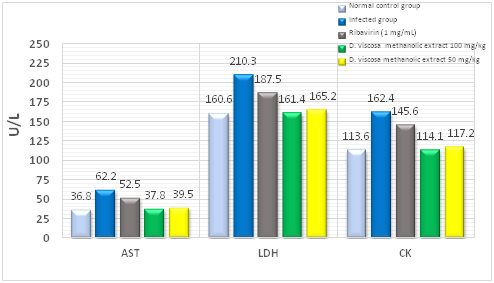 Figure 2 Histogram showing the effects of methanolic extract of D. viscosa leaves on the activities of AST, LDH, and CK in different groups of mice. Serum levels of LDH and CK were measured at day 7. n = 4 for each group. ** P < 0.01 versus the CVB3-infected group.