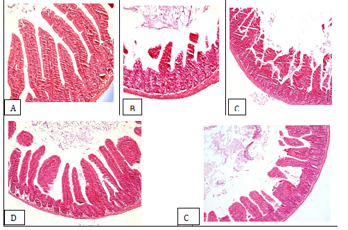 Figure 3 Stained sections of small intestine tissues from BALB/c mice (H&E, magnification 200 X): A: non-infected and non-treated mice; B: infected and non-treated mice; C: RBV mice; D: infected mice with RV and treated with the methanolic extract of D. viscosa at 100 mg/kg body weight; E: infected mice with RV and treated with the methanolic extract of D. viscosa at 50 mg/kg body weight.