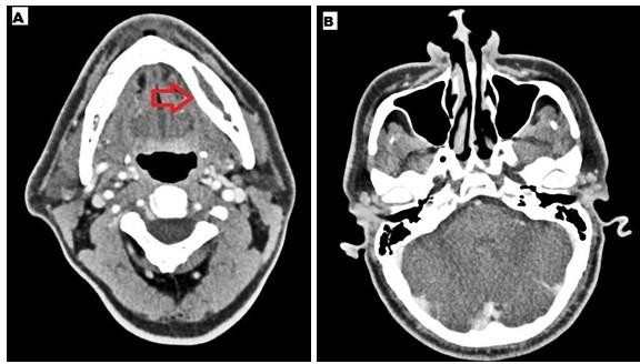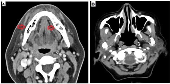 Figure 6 A- CT mandible revealed bilateral mandibular osteomyelitis with cortical expansion, B- CT paranasal sinuses – normal.