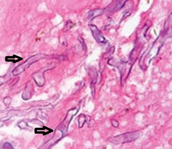 Mucorales are a group of filamentous fungi classified under zygomycetes with worldwide distribution. It commonly presents as rhino-orbito-cerebral disease in diabetic patients.1 In other types of immunosuppression e.g solid organ transplant, hematopoietic stem cell transplant it presents as predominant pulmonary and disseminated disease.2,3 In post Covid-19 era many patients developed diabetes mellitus due to steroid overuse or abuse. Covid-19 associated mucormycosis (CAM) predominantly involves paranasal sinuses with extensive soft tissue disease and subsequent bony and angioinvasion.4,5 Maxillary sinus is the most commonly affected as the spores are directly inhaled into it and start disease.