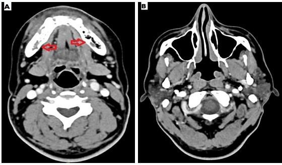 Case 2: He is a 46 years old male presented with pain and swelling of bilateral jaw. He was diagnosed with mild Covid-19 five months ago and received dexamethasone 6mg twice a day followed by once a day for 10 days. There was no history of prior dental procedures. No sinus pain or discharge was present. Sinus endoscopy was unremarkable. HbA1C was 11.2%. Imaging showed bilateral mandibular osteomyelitis (Figure 3) and underwent debridement. Histopathology from the debrided tissue showed broad aseptate fungal hyphae with obtuse angle branching associated with bony and angioinvasion suggestive of mucorales. Few actinomycotic colonies are also found interspersed in the tissue biopsied. Culture was negative for fungal organisms. He was started on injection amphotericin b deoxycholate due to cost constraints and developed acute kidney injury after 5 days. As the disease was limited to bone and he could not tolerate injection amphotericin b for more than 5 days we switched him to tablet posaconazole. Trough concentration was measured after 7 days and found to be 1308 ng/ml. He did well with oral therapy and completed 3 months of posaconazole.