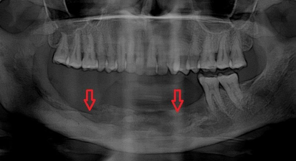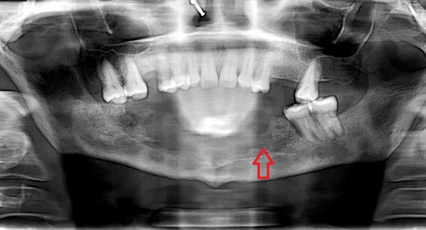 Case 4: A 49 year old lady with no prior co morbidity developed mild Covid-19 pneumonia 3 months ago and was treated with supplemental oxygen and steroids in the form of dexamethasone 6mg once a day for total 12 days. She did not require antivirals. She presented with bilateral jaw pain and numbness over the overlying skin for 3 weeks. She had no prior dental manipulation. There was no sinus symptom associated with jaw pain.