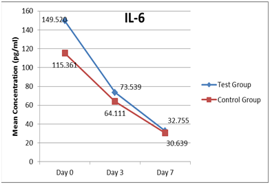 Results: All the three cytokines showed decline in values over the 7 day in both test as well as control groups (p‒ value of <0.001). IL‒6 and TNF‒α levels decreased more precipitously in test group as compared to control group though the difference didn’t reach statistical significance.