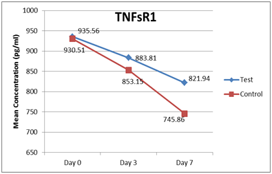 Figure 3 TNFsR1 Levels: Levels decrease over 7 day study period in both the study groups with levels being maximum at presentation and minimum at day 7. This intra‒group difference is statistically significant with p‒value <0.001.
