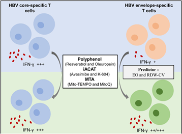 Mitochondria possess significant part in the generation of ATP, innate immune reactions along with apoptosis. More recently studies in the last decade have displayed that utilization of plethora of pathways is done by HBV for influencing the mitochondrial metabolism in the hepatocytes in addition to immune cells. HBV possesses the capacity of changing the physiology as well as metabolism of the mitochondria for the induction of the calcium signaling in addition to interfere with host innate immune reactions. It further has the capacity of facilitating fission along with mitophagy as well as result in repression of anti-viral actions of immune cells. These actions of the HBV on the mitochondria facilitate HBV replication, continuation in addition to pathogenesis. In fact metabolic pathways have been further unravelled to be targeted for the generation of the agents for the treatment of chronic hepatitis B infection. Future studies would further help in translation of this knowledge for its use in clinical scenario for final eradication of cccDNA completely. Restoration of HBV- particular T cell immunity has been recognized in the form of an attractive strategy for the functional cure of chronic Hepatitis B (CHB), which makes it imperative to form valid assays for invigorating as well as monitoring HBV- particular T cell reactions in patients with CHB. Fu et al.,73 recently evaluated hepatitis B virus (HBV) core- as well as envelope (env)- particular T cell reactions utilizing in vitro expanded peripheral blood mononuclear cells (PBMCs) from patients with CHB illustrating separate immunological phases, inclusive of immune tolerance (IT), immune activation (IA), inactive carrier (IC), along with the HBeAg-negative hepatitis (ENEG). Additionally, they assessed the actions of metabolic interventions, inclusive of mitochondria-targeted antioxidants (MTA-mito TEMPO, MitoQ), polyphenolic substances (resveratrol, oleuropein) in addition to ACAT hampering agent (iACAT) [avasimibe, K-604), on HBV- particular T-cell working capacity. They observed that HBV core- as well as env- particular T cell reactions were substantial in agreement along with of greater intensity in IC as well as ENEG in contrast to that in the IT along with the IA stages. HBV env-particular T cells possessed greater impairment however predisposed to react to metabolic interventions using MTA, iACAT, in addition to polyphenolic substances in contrast to HBV core- particular T-cells. The responsiveness of HBV env-particular T cells to metabolic interventions might be anticipated by the eosinophil (EO) count along with the coefficient of variation of red blood cell distribution width (RDW-CV). Thereby concluding that such observations might yield significant knowledge for metabolically HBV- particular T-cells for the treatment of CHB (Figure 4).73
