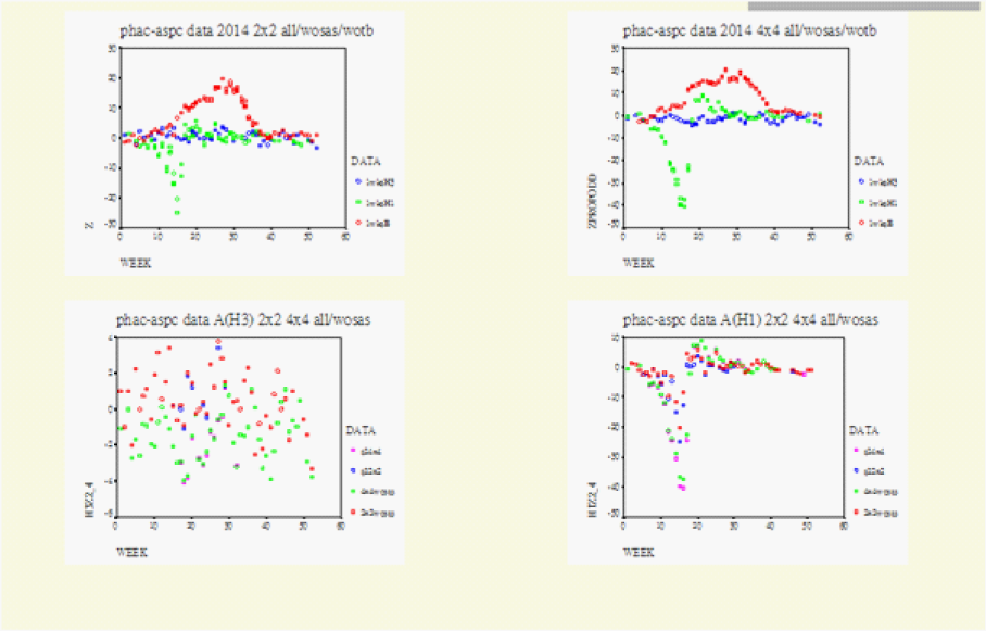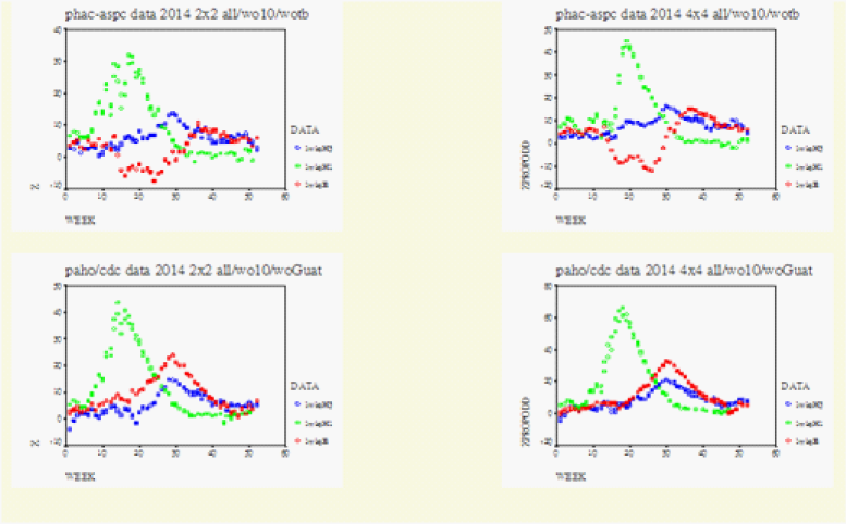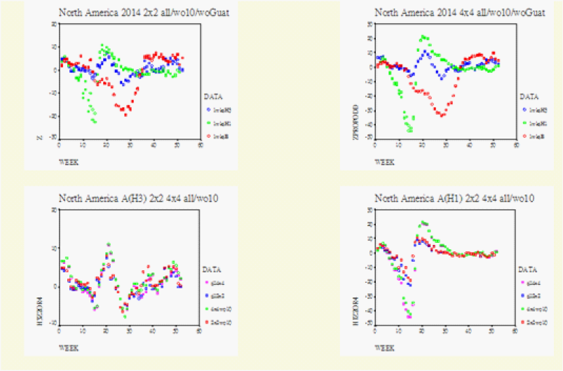 Figure 3 Row1/Row2=Canada/USA and Row1/Row2=Mexico-Guatemala/USA. North American Season 2013-14 year to wk 39 Matched-pair behaviour. Upper. Row1/Row2=Canada/USA on left. Row1 from the left become on the right Row1/Row2=Canada woOt/Ontario. Row2 From the left becomes on the right Row3/Row4= Regions(125810)/Regions(34679). Lower Left. Row1/Row2=Guatemala. Mexico/USA. This Row1 become on the right lower Row1/Row2=Guatemala/Mexico. Row2 on the left lower becomes Row3/Row4=Regions (34679)/Regions(125810) on the right lower z is normal test statistic of McNemar’s Test. Zpropodd is approximate z of the proportional odds comparison of margins (4*4)