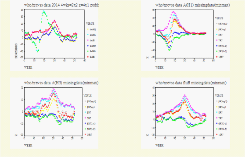 Figure 2 The Missing Data (minimized and maximized). USA Season 2013_14 year to wk39.Left upper, z(2x2) for Col(1,2)=2wks and zodds(4x4) for Col(1,2,3,4)=1wk, and zorzodds is either z or zodds (approximate z). z is normal test statistic row1/row2=(7-10)/(1-6)=10R7 and approximate z (zodds) is for row1/row2/row3/row4=Regions(910/78/56/1234). For right Upper (H1), left lower (H3), and right lower(B), Col(1,2)=2wks, and 10R7=Regions(7-10)/(1-6), 9R7wo10 =(7-9)/(2-6), 8R7=(7)/(1-6), 6R7(1-4) =(7-10)/(5-6)= 6R7 without(1-4), 5R7=(7-10)/(6) without (1-5). For these three figures, missing data in row 1 elevate z, and in row 2 they lower z.