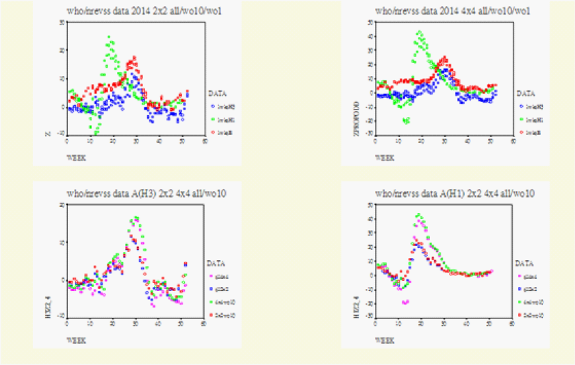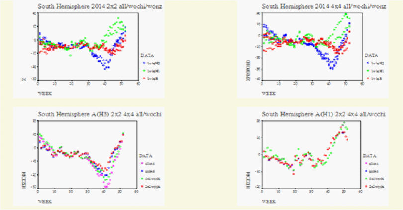 Figure 7 WHO data for the Southern Hemisphere. Southern Hemisphere 2014 wk39. Upper Row shows the general matched-pair behaviour between the 2*2 and the 4*4 Tables. Left Row1/Row2=South_America_Africa/Australia-New Zealand. Row1 from the Left is on the right Row1/Row2=South America/Africa. Row2 from the left is now on the right Row2/Row4=Australia/New Zealand. Left upper, z is normal test statistic of the 2*2 Table. Right upper, zpropodd is approximate z of the 4*4 Table. Lower Row, on each graph the specific matched. Pair behaviour between the 2*2(2wks) and 4*4(4wks): A(H3) on the lower left and A(H1) on the lower right.