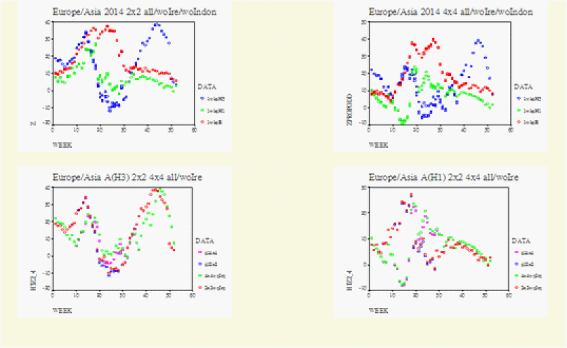 Figure 6 WHO data for Europe/Asia. Europe/Asia 2014 wk39 Upper Row shows the general matched.pair behaviour between the 2*2 and 4*4 Tables. Left Row1/Row2=Europr/Asia. Row1 from the left becomes on the right Row1/Row2=Iceland_British_Isles/Contonental_Europe. Row2 from the left is now on the right Row3/Row4=Continental_Asia/Japan_Philippines_Indonesia. Left upper, z is normal test statistic of the 2*2 Table. Right upper, zpropdd is approximate z of the 4*4 Table. Lower Row, on each graph the specific matched.pair behaviour between the 2*2(2wks) and 4*4 (4wks): A (H3) on the lower right.