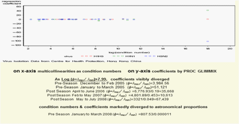 We defined that multicollinearities existed when the condition numbers were above =2,962. As we plotted the log of the condition numbers between the subtypes A(H3N2) and A(H1N1) on the x-axis against their coefficients on the y-axis we found that the coefficients for the five “core” Seasons had formed a horizontal line indistinguishable from the x-axis. On the right beyond the log for the condition number =2,962, we found the coefficients for the two subtypes A(H3N2) and A(H1N1) to be visibly diverged from each other. These diverged coefficients were from the two pre-Season periods, the first one being January to March 2005 for A(H3N2 =51,121 and second one from January to March 2008 with the condition number =807.53/0.000011. The diverging coefficients also came from the three post-Season periods April to June 2006 for A (H3N2 =6,776.93/0.19 =35,668, February to May 2007 for A(H3N2 =4,801.89/0.45247=10,613 and May to July 2008 for A(H1N1 =3321/0.049 = 67,439.