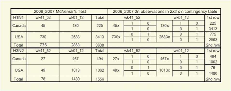to denote a parameter for each subject the odds that the row response falls in category j or below (Instead of above category j) are exp (β) times the odds for the column response. The cross-classification in the above 2x2 Table (McNemar’s Test) where n=3638 actually presents 2n responses for the results of two surveys, those of the first survey in the horizontal row marginal counts and those of the second survey in the vertical column marginal counts. The Cochran-Mantel-Haenszel Tests on the above right present these same data differently as n=3638 separate 2x2 partial tables, one partial table for the two matched responses from each virus. Each 2x2 partial table has one column for each possible outcome, and the results of the first survey in row 1, and the results of the second survey in row 2 and collapsing the 2x2 x n contingency table for USA and Canada 11 yields the marginal counts of the McNemar’s tests.