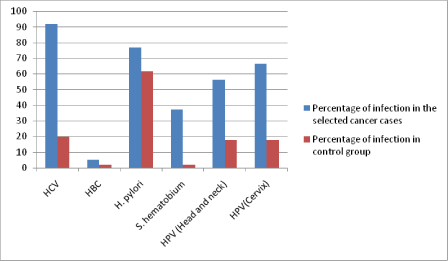Results: Oncogenic infectious agents cause 81.2% of studied cancers. HCV was detected in 92.2% of HCC with a relative risk of 4.6, HBV was detected in 5% of cases and relative risk of 4.8, H. pylori DNA was found in 77% of gastric cancer and a relative risk of 1.2 and S. heamatobium was found in 37.5% of urinary bladder cases with a relative risk of 31. Finally, HPV16 DNA was detected in 56.2% of head and neck cancer and 66.6% of cervical cancer with a relative risk of 3.12 and 3.7 respectively.