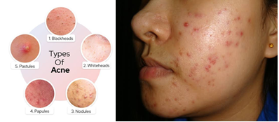 Most common types of acne are Blackheads, Whiteheads, Large, solid, as well as painful lumps or nodules under the skin, Red-colored small and tender papules, Pustules that are papules with pus at their tip under the surface of the skin, which are painful.10
