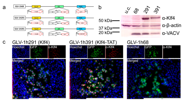 The klf4neg rVACV strain GLV-1h68 encodes gusA (p11 promoter) in the A56R locus. The two klf4pos rVACV strains GLV-1h291 and GLV-1h391 encode for human Klf4 (GLV-1h291) or human Klf4-TAT (GLV-1h391) under the synthetic early/late promoter (SEL) in the A56R locus. P7.5 = VACV 7.5K early/late promoter; P11 = VACV p11 late promoter; SEL = VACV synthetic early/late promoter; ruc-gfp = Renilla luciferase-green fluorescent protein fusion gene; lacZ = beta-galactosidase; gusA = beta-glucuronidase; tfr = transferring receptor; klf4 = Krueppel-like factor 4; TAT – HIV Tat protein transduction domain (GRKKRRQRRRPP)