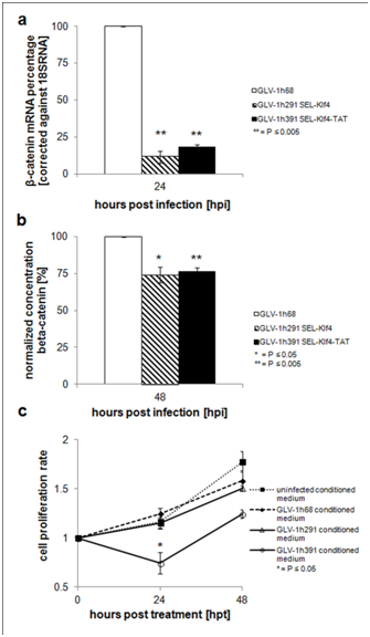 GLV-1h291-infected cell lysates showed no reduction in proliferation. Conditioned media containing mock-infected or GLV-1h68-infected cell lysates also had no effect on cell proliferation. These findings strongly indicate the functionality of the TAT transduction domain fused to the Klf4 in enabling the transcription factor to enter cells by passage through the cytoplasmic membrane and initiate cell growth arrest.