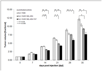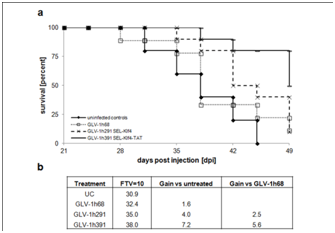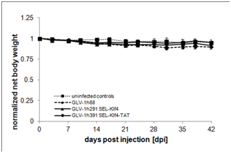 Mice were cared for in accordance with approved protocols by the Institutional Animal Care and Use Committee of Explora Bio labs (San Diego Science Center, protocol number EB11-025). Five- to six-week old male Hsd, athymic Nude-Foxn1nu mice (Harlan, Indianapolis, IN, USA) were implanted subcutaneously (s.c.) with 5x106 HT-29 cells (in 100 µL PBS) into the right hind leg. Treatment started when tumors reached a volume of 200-300 mm3. GLV-1h68, GLV-1h291 and GLV-1h391 were administered systemically by intravenous (i.v.) injection of 1x106 PFU in 100 µL PBS at day 0 (n=10 per group)into the lateral tail vein. Control animals (n=5) were injected with PBS only. Absolute tumor growth was measured once a week using a digital caliper and tumor volume was calculated as 0.5 x (height-5 mm) x width x length (mm3). Fractional tumor volume (FTV) (tumor volume on day x / tumor volume on day 0) was used to monitor therapeutic efficacy. Body weight was measured as net body weight (g) (bodyweight (g) – tumor volume/1000 mm3), to exclude tumor mass, and normalized to the initial body weight (day 0). Mice were sacrificed when the net body weight dropped 20% of the initial body weight or the tumor volume exceeded 4000 mm3. The experiment was terminated 49 days post injection (dpi).