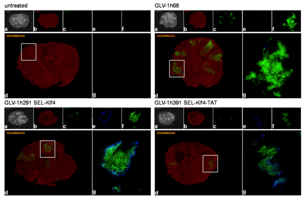 Untreated, GLV-1h68- and klf4-expressingvaccinia virus-treated mice were sacrificed 21 dpi. Whole tumor cross-sections