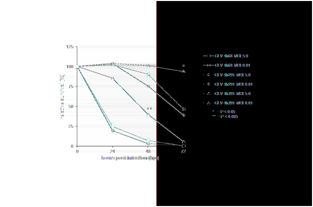 Thus, the two klf4-expressingrVACV strains GLV-1h291 (Klf4) and GLV-1h391 (Klf4-TAT) exhibited strong Klf4 expression and down-regulation of cellular β-catenin levels in infected HT-29 cells. In addition, GLV-1h391 infected cell lysates proved potent in inducing cell growth arrest of HT-29 cells in culture. Therefore, both virus strains were next analyzed for their replication ability and cytotoxic potential in comparison to the control strain GLV-1h68. The results indicated that both virus strains GLV-1h291 (Klf4) and GLV-1h391 (Klf4-TAT) replicated similarly in HT-29 cells. After virus infection at a MOI of 0.01 (Figure 3b), a three-log increase in virus titers was observed from 6 to48hpi, and remained at a consistent high level there after. However, this level of replication was inferior to that of GLV-1h68. The relative replication efficiencies of the klf4-expressing viruses were further analyzed by infecting HT-29 cells at a high MOI (5.0) to synchronize the infection. After 24 hours of infection, again the virus titers of the control strain GLV-1h68 in HT-29 cells infected at a high MOI were statistically significantly higher (P≤0.05) than both klf4-expressing virus strains, GLV-1h291 andGLV-1h391.