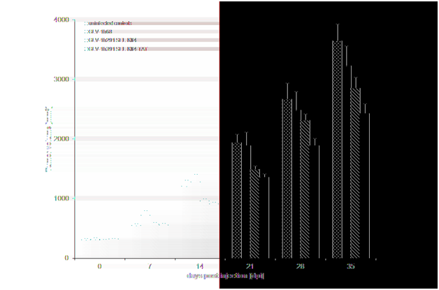 The statistical significance of differences between groups of animals was analyzed using one way ANOVA in STATISTICS.). Log rank tests were performed to analyze the statistical significance of survival between the untreated control group and rVACV treatment groups. P< 0.05 was considered significant.