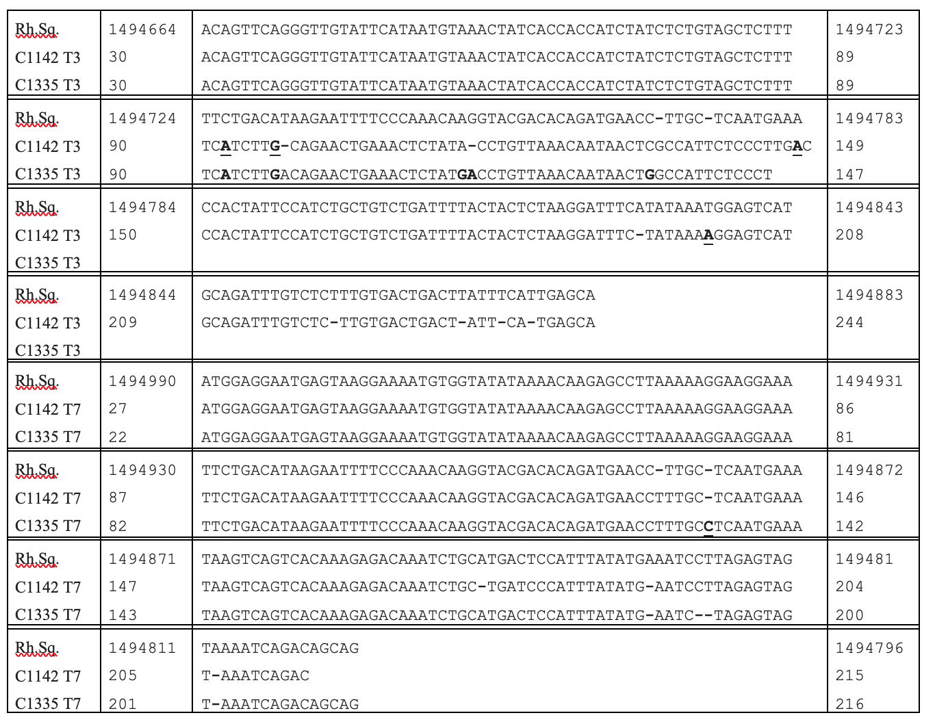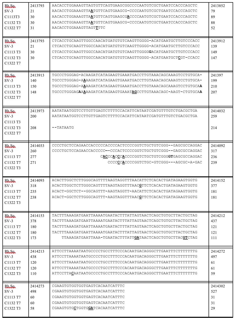 Footnote: The rhesus monkey sequence (Rh.Sq) is viewed as the primary sequence from which the other sequences have diverged. An inserted nucleotide in any of these other sequences requires that a dash (-) be inserted in the corresponding location in the Rh.Sq. The inserted sequence is shown in bold without underlining. A deleted nucleotide in the other sequences is also shown as a dash (-) in its sequence. Substituted nucleotides in the other sequences are shown as a bold and underlined nucleotide. SV-3 refers to stealth virus-3.