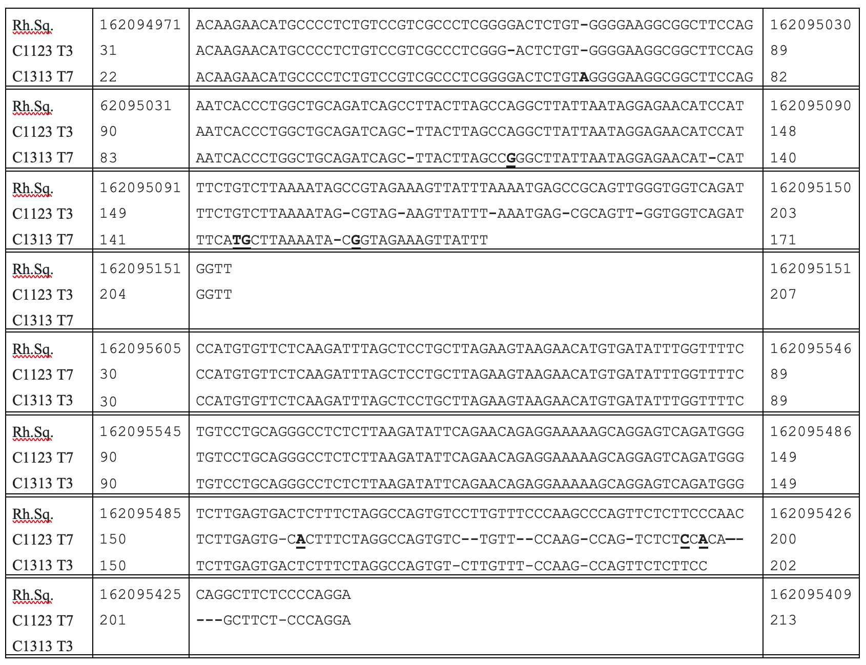 Footnote: The rhesus monkey sequence (Rh.Sq) is viewed as the primary sequence from which the other two sequences have diverged. An inserted nucleotide in any of these two sequences requires that a dash (-) be inserted in the corresponding location in the Rh.Sq. The inserted sequence is shown in bold without underlining. A deleted nucleotide in one or both of the other two sequences is also shown as a dash (-) in the sequence. Substituted nucleotides in the other two sequences are shown as a bold and underlined nucleotide.