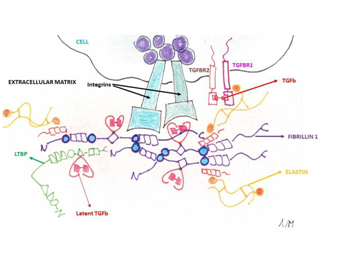 Figure 1 The ECM and the cellular surface components involved in the collagen disorders and their relationships. The chemokine Transforming Growth Factor-b (TGF-b) has a pivotal role being sandwiched in the fibrillin (FBN1 gene) and latent binding proteins (LTBP gene) and being the ligand of the Transforming Growth Factor-b Receptor 1 (TGFBR1 gene) and Transforming Growth Factor-b Receptor2 (TGFBR2 gene). Additionally, elastin fibres (ELN gene) are bound by S-S bridges to the fibrillin microfilaments.
