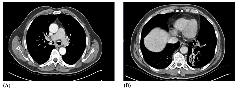 Blood tests done showed a mild leukocytosis (17300IU/mL); renal and hepatic panels were normal. Arterial blood gas analyses were also normal. His chest radiograph showed no abnormality, except a suspicious heterogenic density behind the left heart silhouette. CT scans of the thorax are shown below in Figure 1A and Figure 1B. Bronchoscopy was then performed, which showed a polyploidy lesion on the posterior wall of the left main bronchus, whereas an oval shaped mobile body was observed over the right main bronchus, under the right upper lobe division (Figure 2A) (Figure 2B). The pathological diagnosis of the specimen taken from the polypoid lesion was compatible with active chronic granulation.